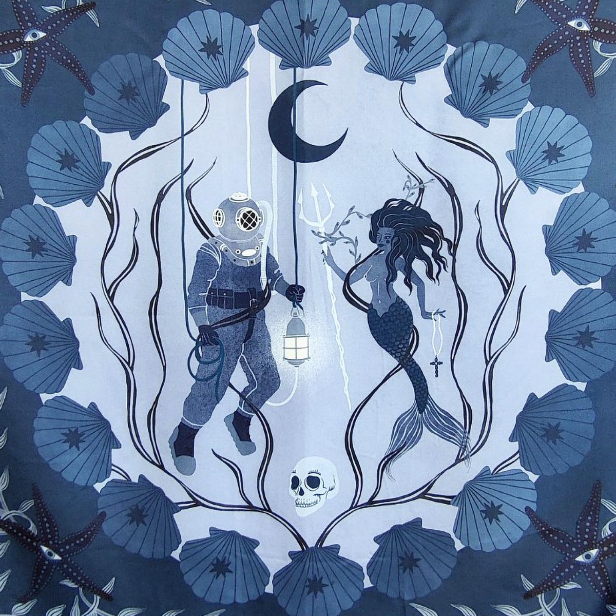 This design features a curious meeting between a deep sea diver and mermaid, down on the seabed. Perhaps a romantic tale will unfold, but the skull suggests the lovely sea maiden might not be all she seems. The design is also adorned with scallop shells, twisted seaweed and all-seeing starfish. Printed in limited numbers, here in the UK.