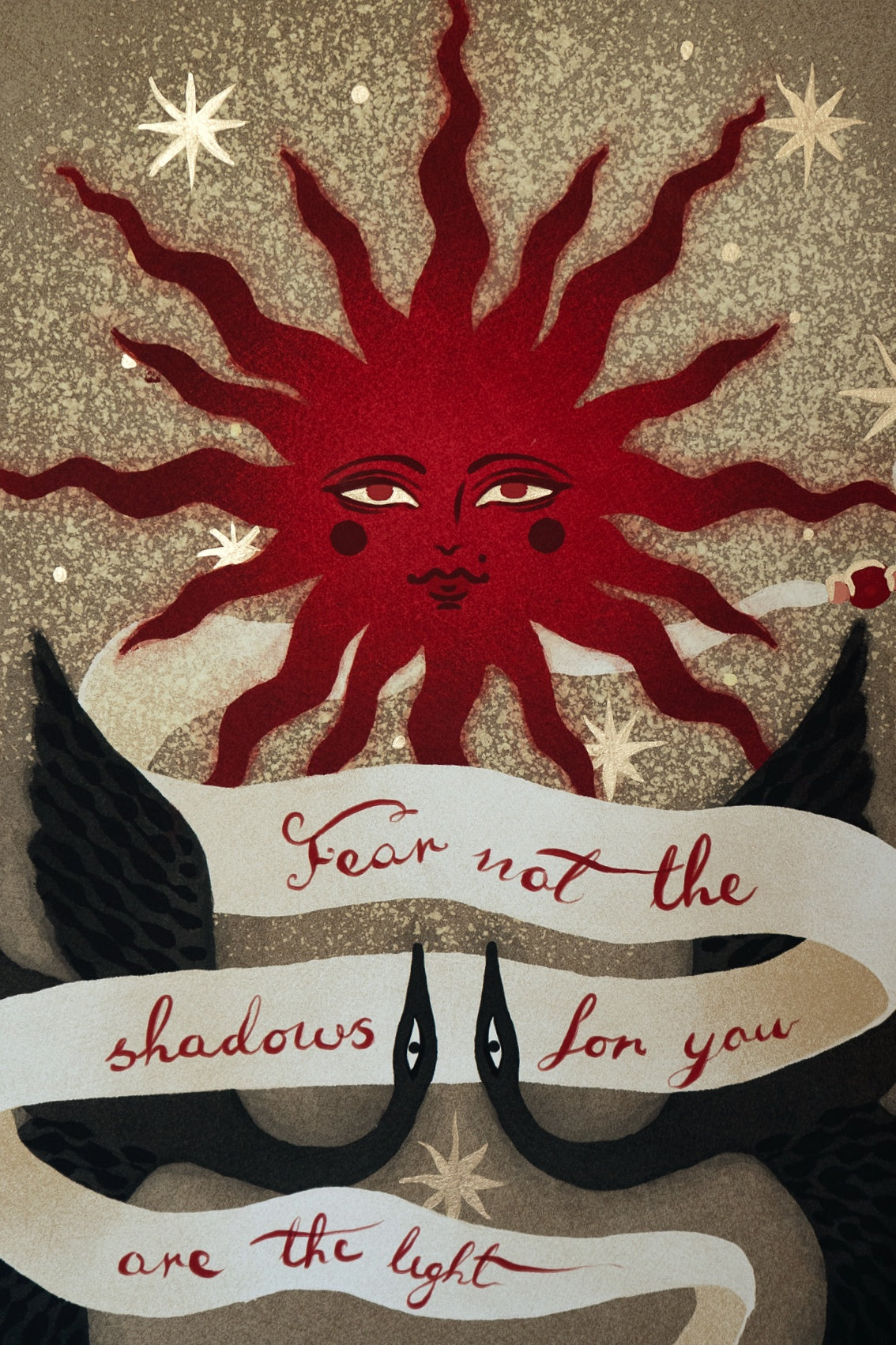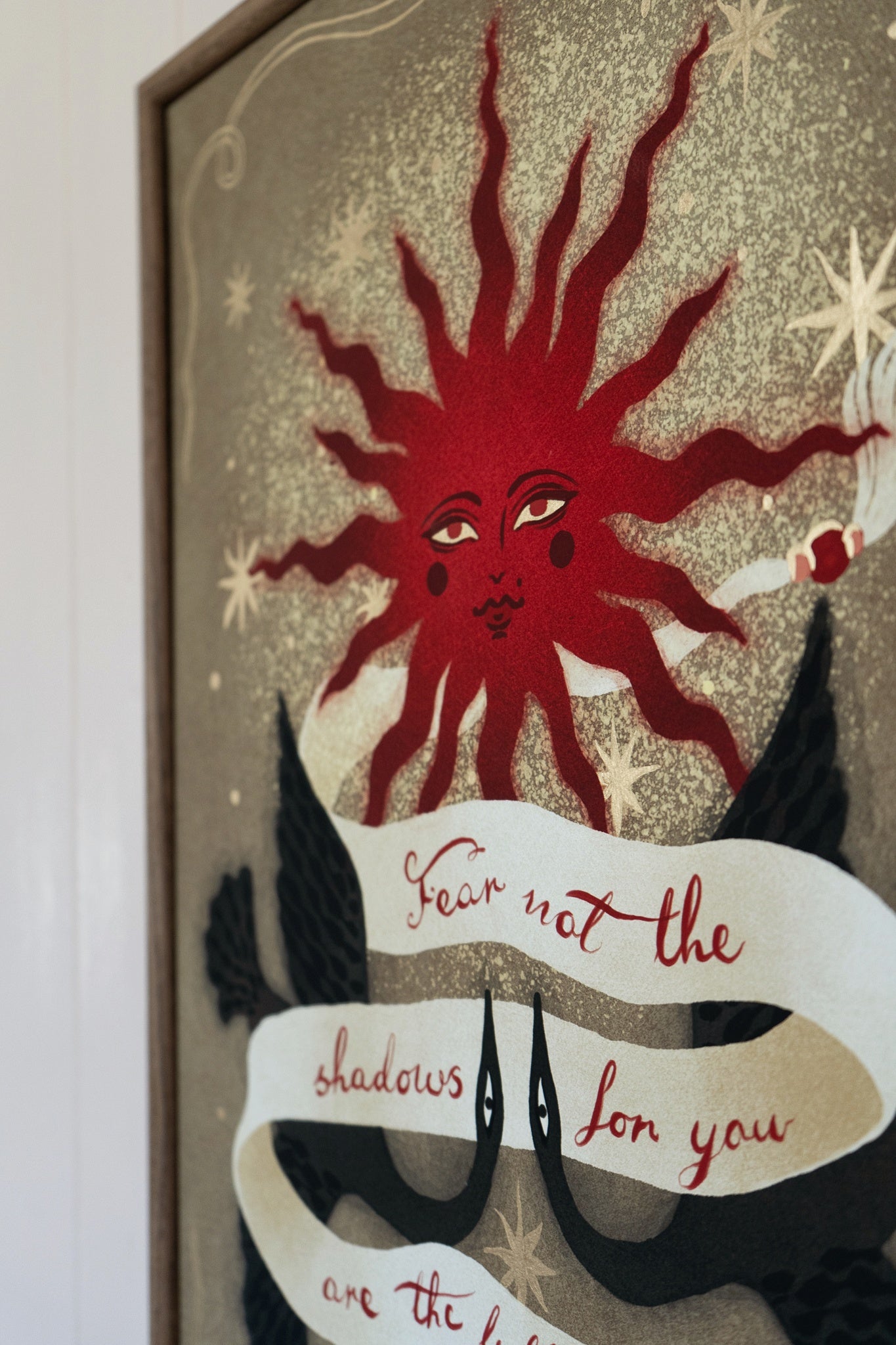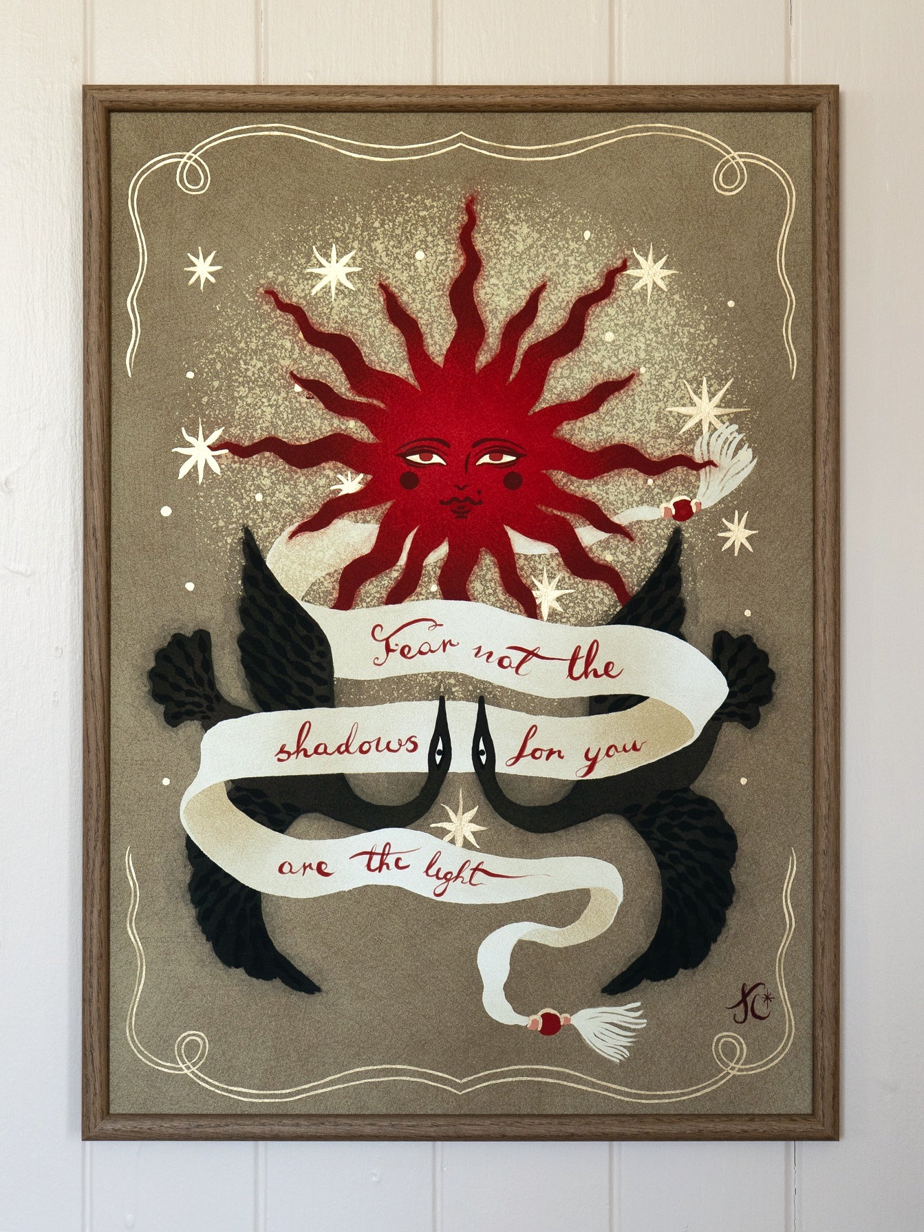 Fear not the shadows, for you are the light. Limited edition giclee print, hand finished in liquid gold leaf. MADE TO ORDER. Unframed.