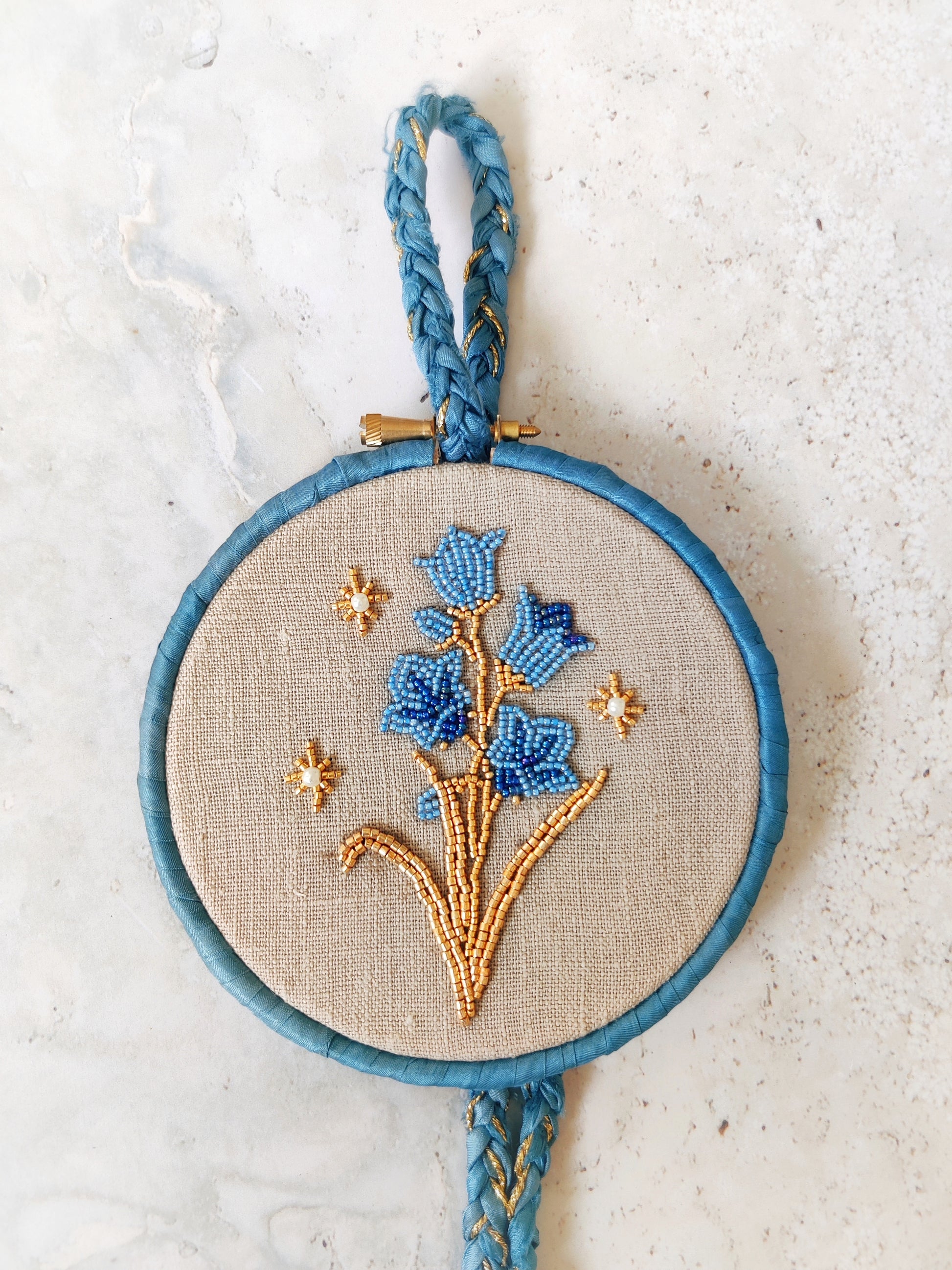 This hand embroidered art piece pays homage to the beautiful spring wildflowers of England. One of my favourite things to do at this time of year is to take long walks in the local woodland, foraging for wild garlic and admiring the carpet of bluebells and harebells.